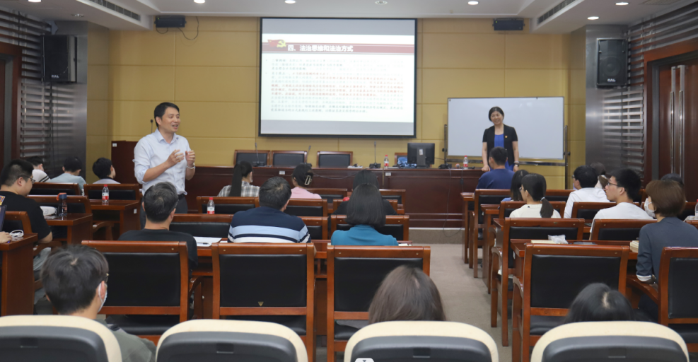 为深入开展学习贯彻习近平新时代中国特色社会主义思想主题教育,5月15日下午,校党委常委、统战部部长周杰普教授围绕“习近平新时代中国特色社会主义思想专题——以全面依法治国重要思想涵养法治思维”主题向经济学院、高等研究院师生党员讲授专题党课。