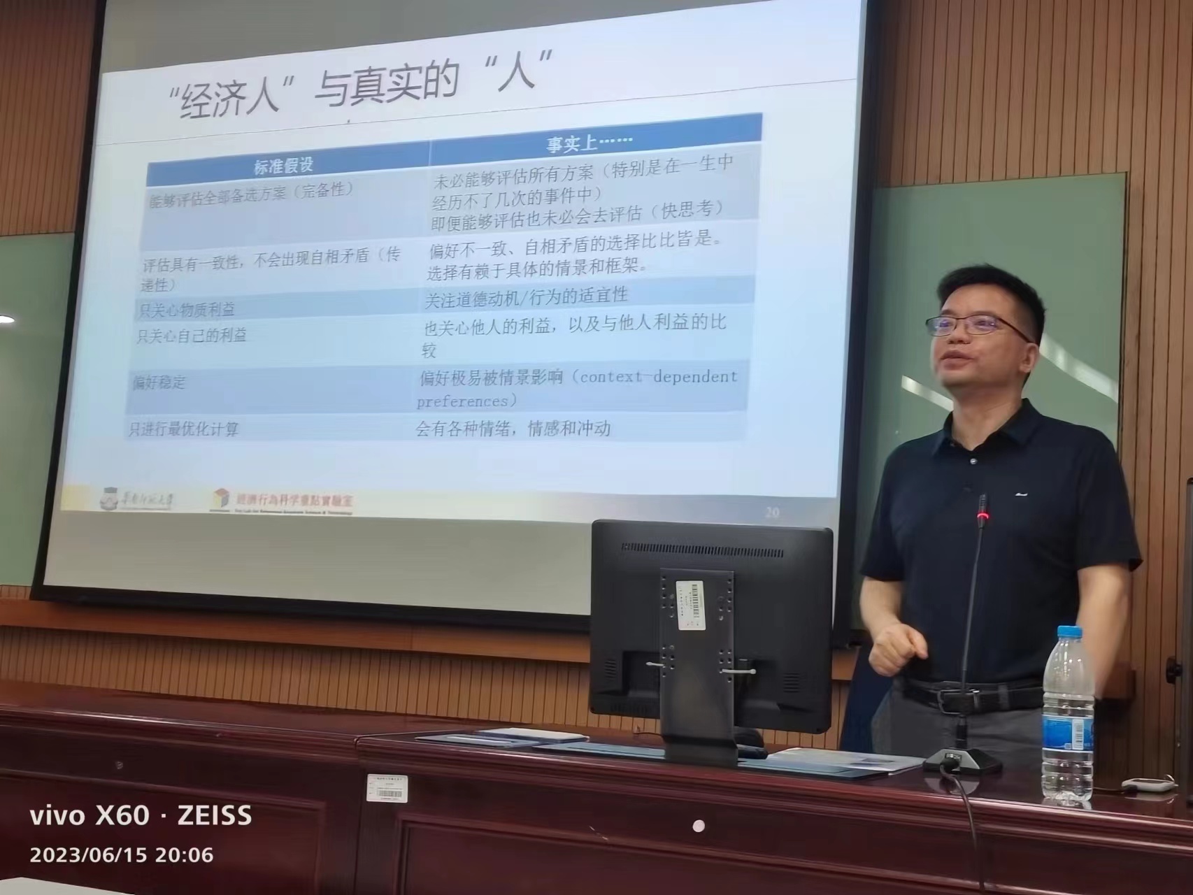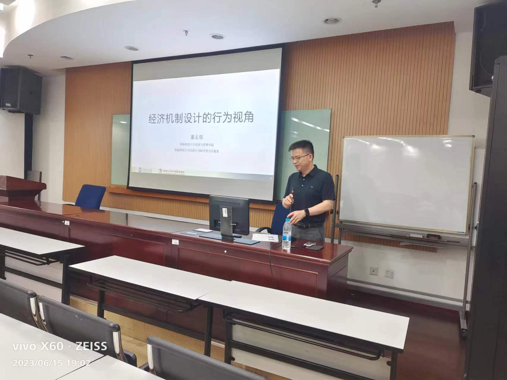 2023年6月15日19:00在经济学院楼412会议室举行了拔尖班系列讲座。我们邀请了华南师范大学经济与管理学院董志强教授从行为经济学的视角,对经济机制设计做了阐述。行为和演化范式经济学是最近三十年涌现的一种新的经济学分析视角和方法。它从行为、制度和演化视角重新表述经济学的微观基础,寻找一个能够解释异质性的框架,也为经济机制和政策设计提供了新的洞见。通过讲座让学生们认识了人们的决策行为背后的心理机制。通过了解行为经济学的概念和实践案例,意识到人们的决策往往受到情绪、认知偏差和社会压力等因素的影响。之前对经济学的理解一直停留在理性人假设的范畴中。通过这次讲座,了解到行为经济学的基本框架和思考模式。