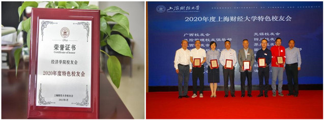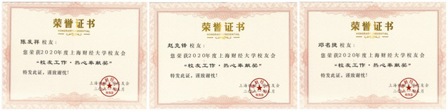 5月22日下午,上海财经大学2021年校友年会暨校友会二届六次理事会在上海财经大学中山北一路校区顺利召开。来自海内外近一百六十位备案校友组织的校友代表、理事会九十一位理事、监事会监事参加了会议。在年会重要一环的工作表彰环节中,经济学院校友会获评为2020年度“特色备案校友组织”,吴亚东校友荣获2020年度捐赠支持校友工作突出贡献奖,陈发祥校友、赵克锋校友、邓名捷校友获评为2020年度校友工作热心奉献奖,黄振兴教授荣获“2020年度支持合作发展工作好领导”,校友会干事、学院校友工作联络人胡倩楠老师荣获“2020年度合作发展工作先进个人”。