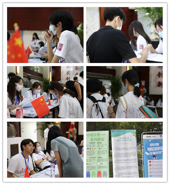 在此之后,新生们在迎新工作人员的指引下,来到自己对应的班级报到处完成新生签到和个人信息的填写,同时以门外易拉宝为引,就上海垃圾分类方式、网络安全、防疫注意事项进行了详尽的讲解。