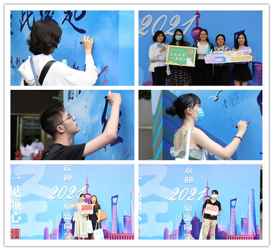 报道完成后,新生在志愿者的指引下于经院门口的展板上进行签名,合影留念。