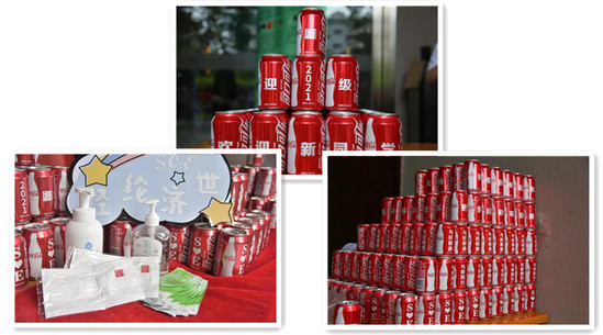 经院门口陈列着学院为全体新生精心定制的“欢迎2021级新同学、青春扬帆起航”等字样的定制可乐。