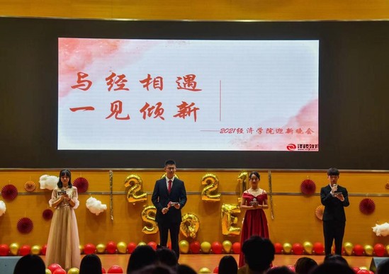 2021年9月27日晚,由经济学院分团委与学生会主办的“与经相遇,一见倾新”经济学院2021级迎新晚会在创业中心一楼报告厅完美落幕。