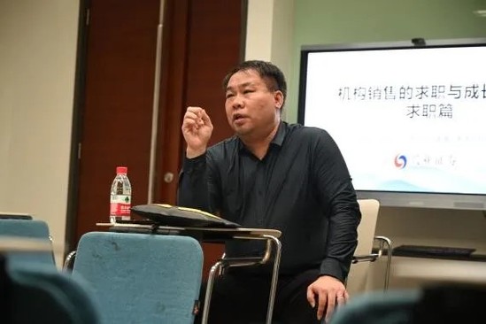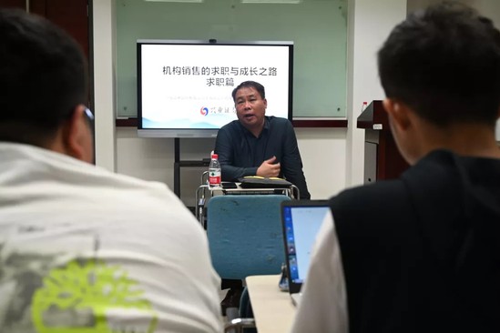 在本次分享会上,嘉宾赵翔老师幽默风趣的语言与风格使同学们深深得被吸引。赵老师从自己的大学经历与求职亲历为切入口,将证券公司的架构、证券公司各部门尤其是经纪业务总部、自营部、投行部的具体情况、私募基金的分类等知识深入浅出地传授给同学们。
