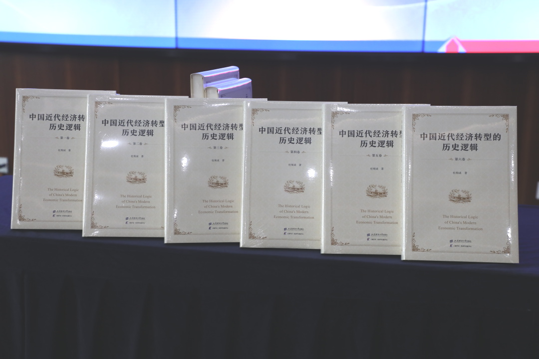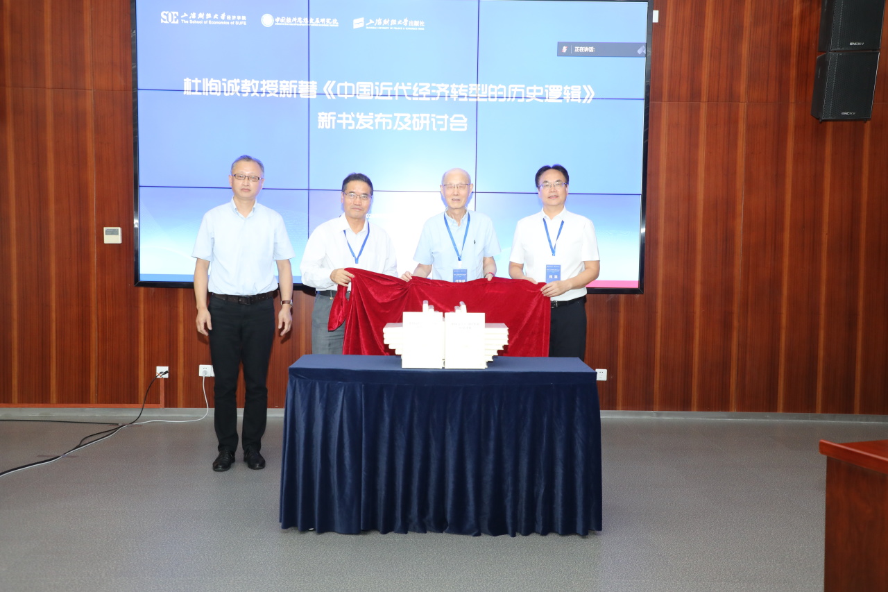 在燕红忠教授的主持下,杜恂诚教授和魏明孔研究员上台为新书揭牌,并由黄磊社长、程霖教授进行见证。