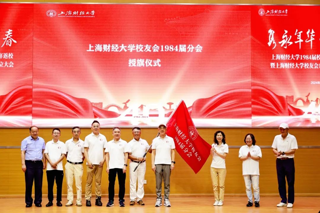 朱鸣雄副书记为上海财经大学校友会1984届分会授旗。1984届分会会长、副会长和秘书长共同参与了授旗仪式。