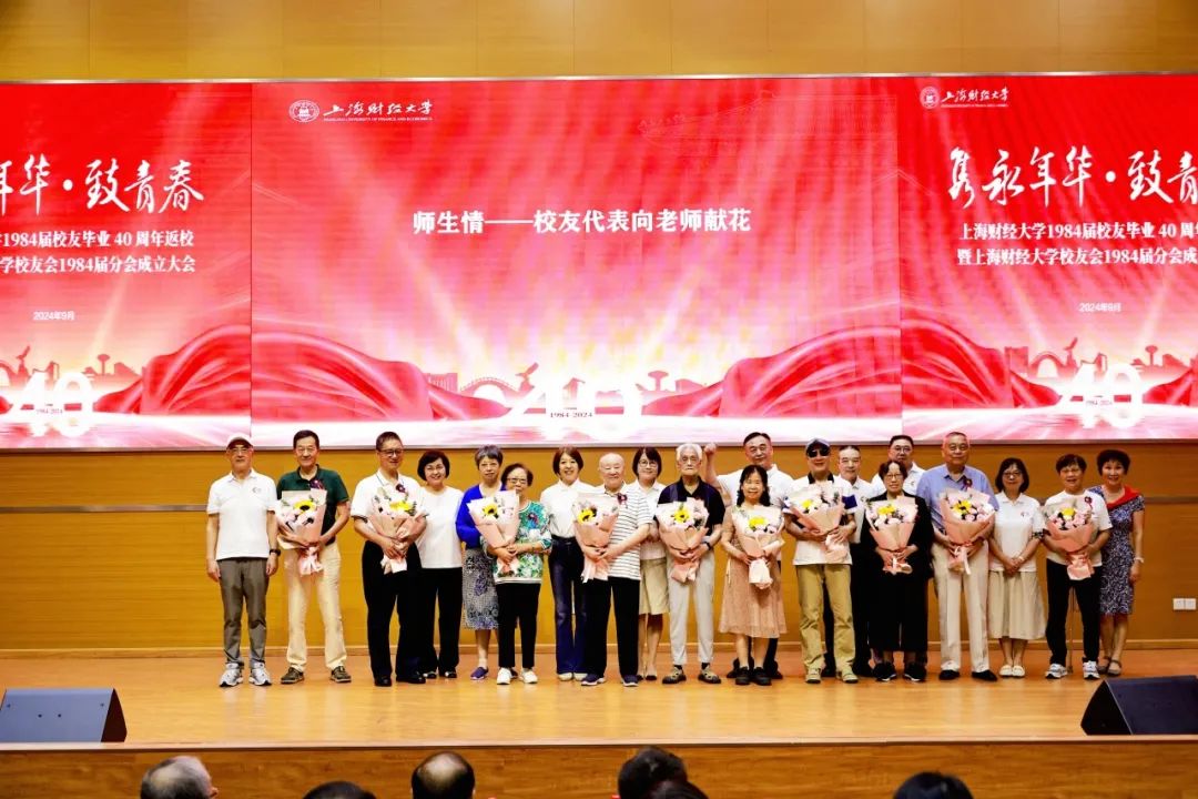 1984届校友代表分别向老教师代表献花,感谢老师们当年的谆谆教诲和培育之恩。