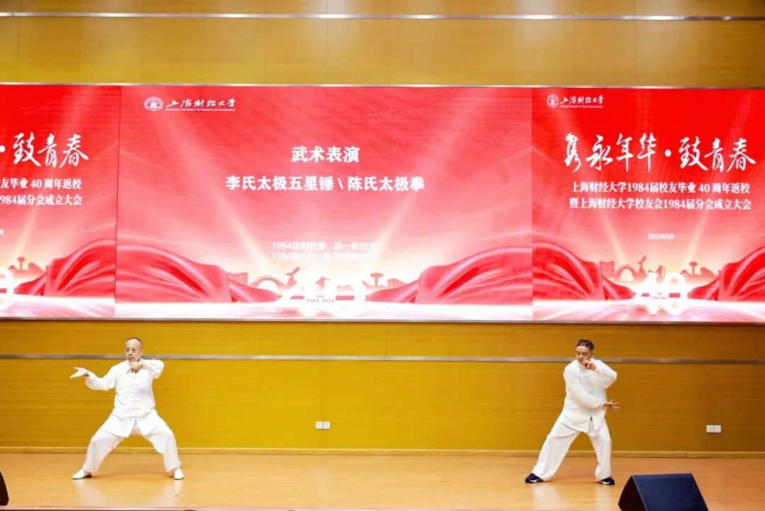 校友们一同观看了毕业四十周年纪念短片,通过一张张老照片回忆当年在母校读书时的青葱岁月。1984届校友代表们还献上了“校友情”系列节目,通过诗歌朗诵、旗袍仪态舞、沪语朗诵和武术表演等形式表达对母校的思念和眷恋,对同窗的牵挂和情谊。