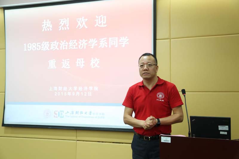 上海财经大学方华副校长(时任政治经济学系教师)、上海财经大学自由贸易区研究院院长赵晓雷教授(时任该班班主任)、上海财经大学关工委常务副会长毛荣生教授(时任该班《哲学》课授课老师),经济学院前常务副院长胡永刚教授(时任该班《资本论》课授课老师),合作发展处副处长张彦波老师及经济学院副院长孙燕教授、副书记杨卫东老师、高等研究院院长助理赵克锋副教授等受邀参加返校纪念活动。活动由杨卫东老师主持。