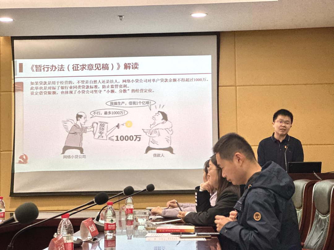 李双建老师党课主题为《全面加强金融监管、助力金融强国建设——对<小额贷款公司监督管理暂行办法(征求意见稿)>解读》。他表示,党的二十届三中全会锚定推动金融高质量发展、加快建设金融强国的目标,对金融体制改革作出前瞻性、系统性的顶层设计,与习近平总书记关于金融工作的一系列重要论述和中央金融工作会议部署一脉相承,也为做好金融领域改革发展工作提供了根本遵循和行动指南,必将为加快建设金融强国注入强大动力,不断开辟金融工作新局面。他还就金融强国的内涵、近几年小额贷款公司行业发展和运作的实际情况及国家金融监督管理总局发布的相关制度进行了详细解读。