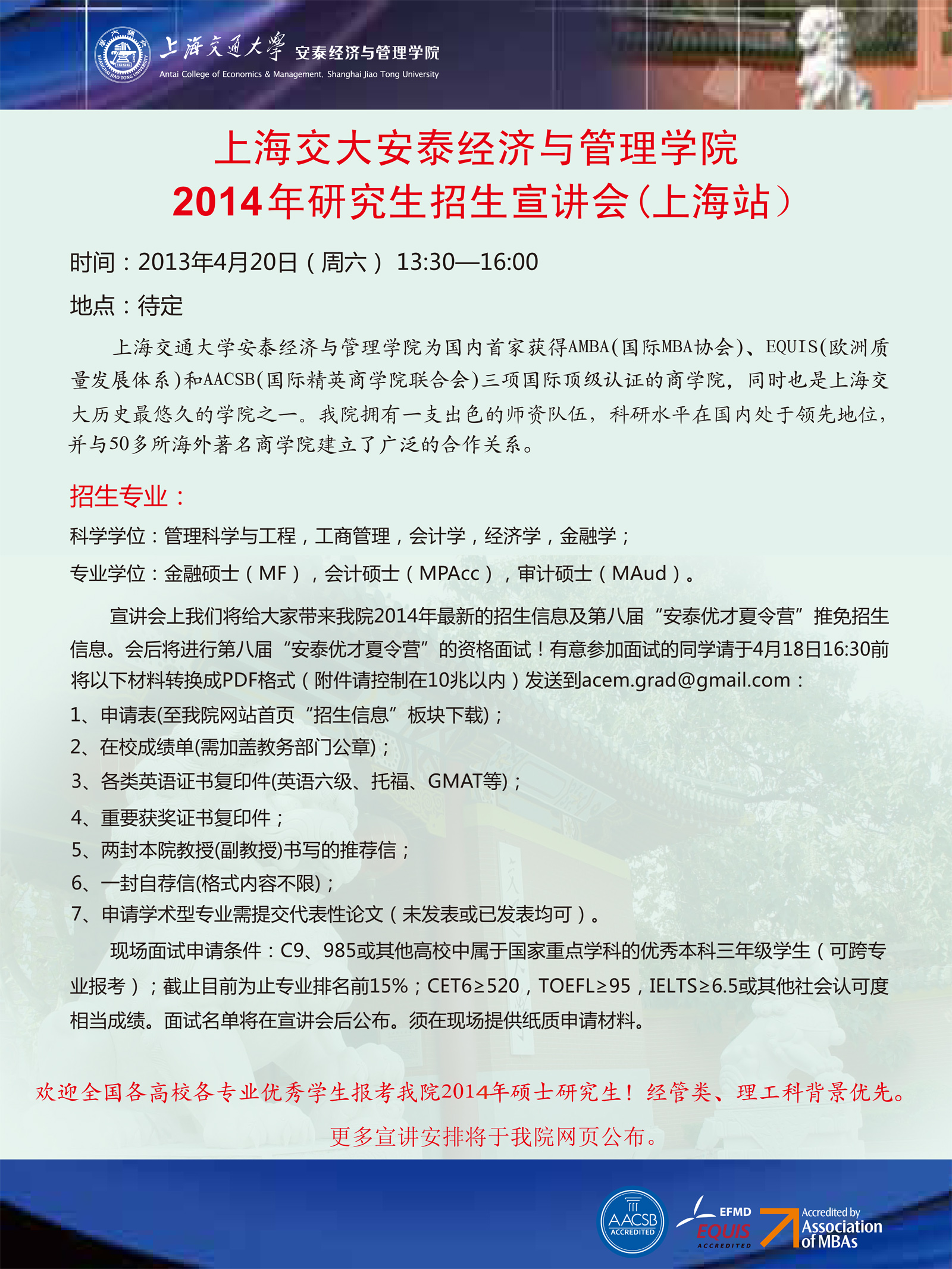 宣讲会上我们将给大家带来我院2014年最新的招生信息及第八届“安泰优才夏令营”推免招生信息。
