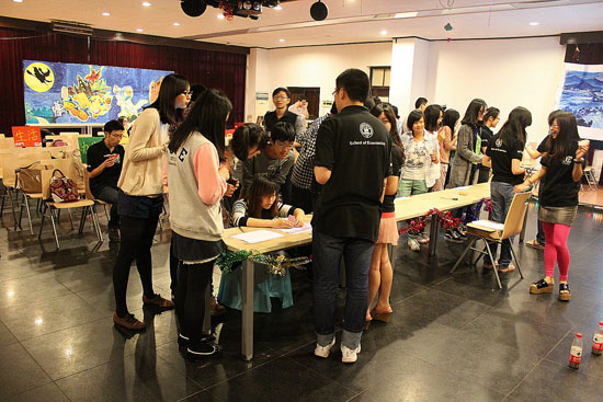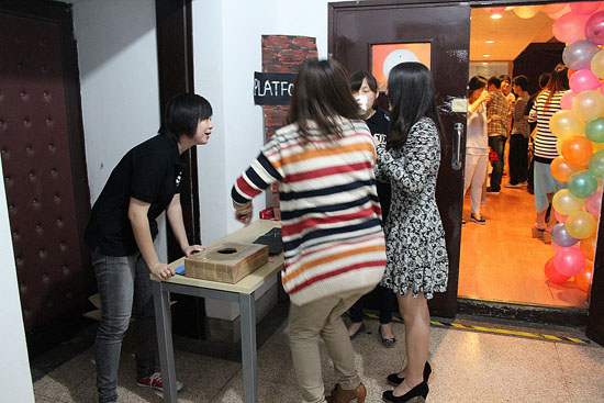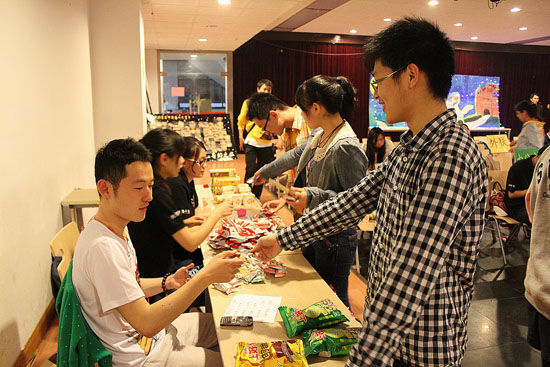 在告别礼开始之前,首先进行了自由游戏环节。每位入场同学可以凭先前得到的五张兑换券进行游戏,最终可以凭借兑换券兑换礼品和食物。而在六点半时许,团学