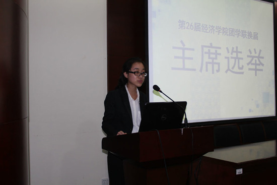 第二阶段为主席换届选举,选举前由前任主席谭朱昳代表第25届主席团做了本学年工作总结。紧接着参选的八位候选人依次上台,在5分钟的时间里进行演讲。各