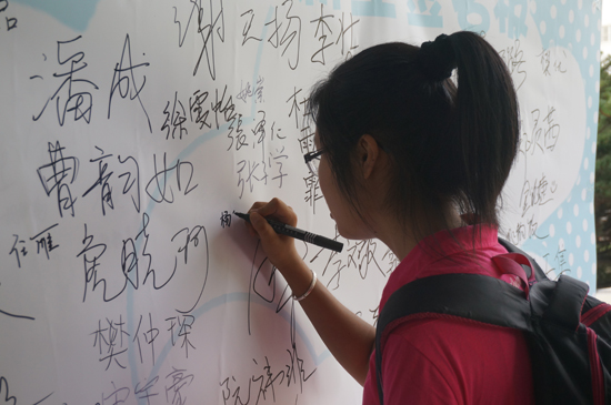 言板上签下自己的名字,并合影留念,以此表达对新生活的憧憬和热忱。当天,校党委副书记陈宏老师、副校长刘兰娟老师、校学生处处长冯润民老师等校领导也来