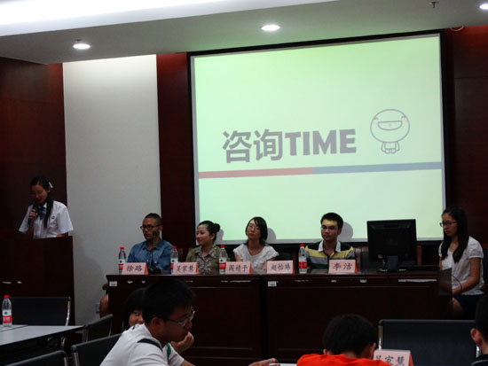 咨询会开始,学长学姐们就自己在大学的经验与体会做出介绍,指出新生应尽快适应大学生活并对自己今后的发展方向做出一定的规划,同时指明现有大学生毕业后