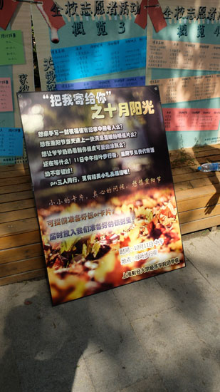 我国传统节日重阳节即将到来,为了发扬尊老的传统美德,10月11日中午,经济学院团学联外联部在绿叶步行街举办了“把我寄给你之十月阳光”的重阳节特别活动,为财大学子提供了向家中老人寄送祝福的机会。