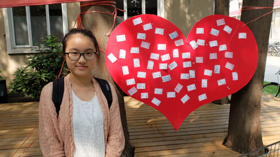 多多的同学参与进来,为远方的亲人送去祝福。同学们还在便利贴中亲手写下对老人们的祝福,贴于特制的爱心板上,并与之合影留念。