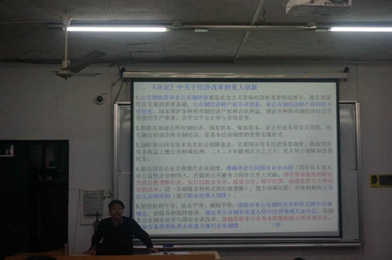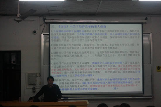 《决定》中关于经济改革方面的创新进行了深入而细致的讨论,并发表了精辟的见解与分析,引导同学们对国家经济体制改革做出自己的深入思考。