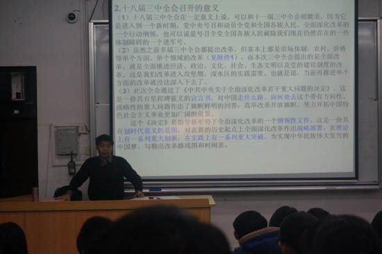 课堂上,老师生动翔实地为同学们讲述了十八届三中全会的背景和意义,解析了《中共中央关于全面深化改革若干重大问题的决定》的主要内容,加深了同学们对这