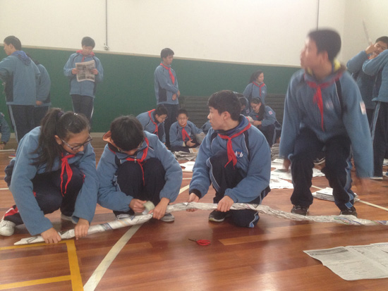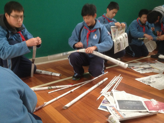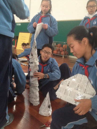 布完规则后,所有班级所有成员都热情洋溢地开始搭建报纸塔。他们分工明确,有的人专心地把报纸卷成长条,有的专门负责粘胶带,还有的在策划整体结构。不久