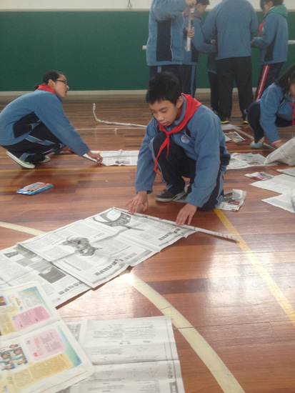 志愿者队已经在两周前通知了三门中学的学生将要举办此活动,所以同学们都早早地准备好了材料。比赛当天,每个班级都扛着一沓沓的报纸来到室内体育场。在宣