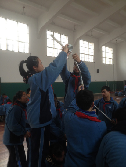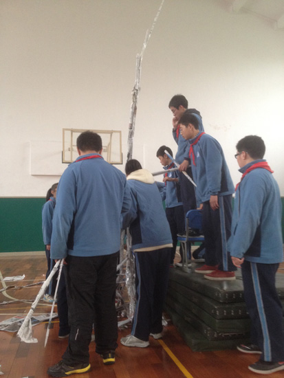 激发同学们的创造力锻炼他们的毅力,和培养他们的团队精神。比赛内容非常简单,初二年级以班级为单位,用报纸和胶带搭建一座塔,塔越高越好。任何工具都能
