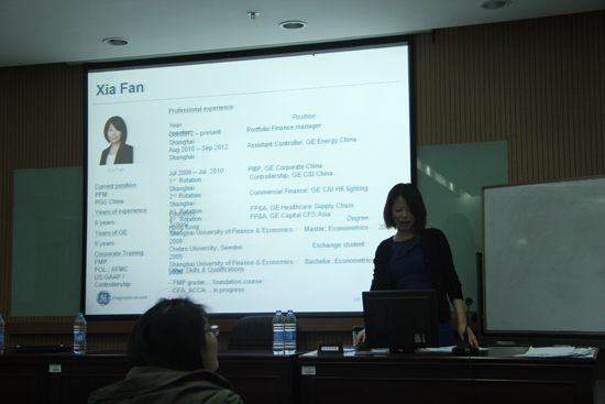 从GE(通用电气)归来,为经院学子们分享了她自己的职业发展经历。夏凡学姐首先以简历的形式介绍了自己毕业进入GE以来的职业轨迹,之后详细介绍了GE