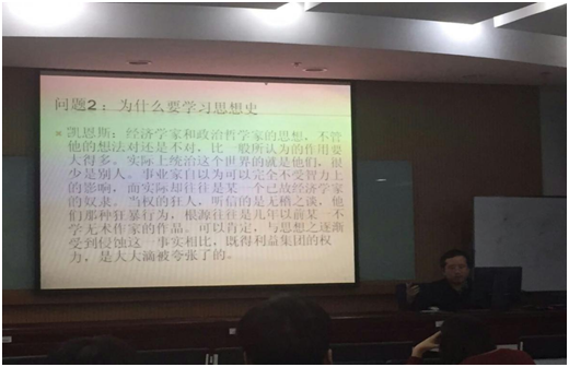 主持人介绍过今天的讲座主题后,同学们鼓掌欢迎梁捷老师开始今天的讲座。梁捷老师首先以近年来经济学的教育变化来引入今天的话题。梁老师简略地为同学们介绍了过去十年、二十年乃至两百年前的经济学与现代经济学的变化,然后由此引出了本次讲座第一个为同学们阐述的问题:什么是思想史。对于这个问题的解释,梁老师从哲学、物理学、数学等多方面与经济学进行类比,让同学们对这个问题有了更加深刻的认识。