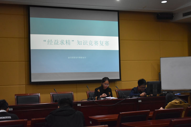 11月3号晚上,在经济学院511教室,“经益求精”知识竞赛的复赛如期举行。本次竞赛的题目涵盖了经济、历史、地理、音乐、美术、文学等多个学科,可谓是对各位选手知识面广度的一大挑战。从几十名参赛同学中脱颖而出的六名优秀选手强强对决,为我们上演了一场精彩纷呈的知识较量。