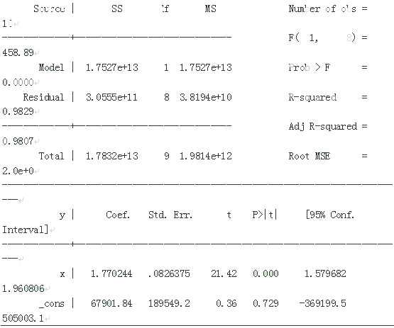 由回归分析结果可知,该模型通过了T检验。且该模型的F检验值F=458.89,大于取显著水平α=0.05的临界值,说明经济总量与最终消费之间存在的