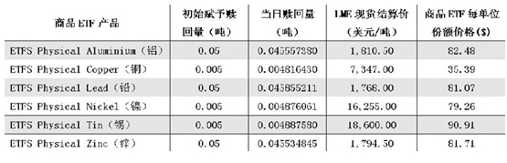 上表中的第2列是商品ETF产品初始被赋予能赎回对应金属的数量。第3、第4、第5列分别表示在2012年6月26日商品ETF产品的当日赎回数量、LME现货结算价、商品ETF每单位份额的价格。其中,第5列中的“商品ETF每单位份额价格”可由第3列乘以第4列得到。以ETFS Physical Copper为例,初始发行时赋予每一份额ETF可赎回0.005吨现货铜,ETF可赎回金属量并不是固定不变的,而是会随着ETF份额价格和金属价格等因素进行变动。ETF赎回实物金属时,还必须先结算对应金属的仓储费、保险费等费用。