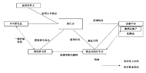 发行者与授权参与者签订协议,赋予后者在市场上向普通投资者销售ETF基金份额的权力,普通ETF投资者只能在二级市场买卖该ETF基金份额。为了确保发行者发行的ETF基金份额有相应的商品资产支持,发行者还会与商品合约对手方签订证券协议。发行者需要根据协议全额持有对手方发行的、与持有商品期货头寸相对应的证券。该协议是为了确保发行者发行的ETF基金份额有必要的资产作保证,并且这种资产能够与相应的商品资产相对应,投资者通过买卖ETF基金份额、授权参与者通过申购和赎回证券,影响商品合约对手方持有的期货等衍生品头寸,实现对商品价格波动的跟踪。商品合约对手方还需在指定的金融中介设立一个担保账户。只要发行者发行一定数量的ETF份额,对手方就需要按照一定计算规则在担保账户中存入相应的金额。