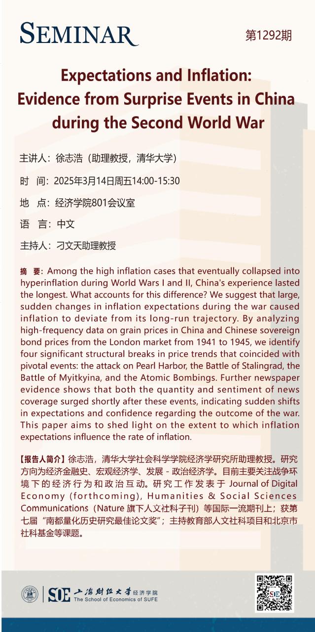 【第1292期】 3月14日经济史学学术讲座:Expectations and Inflation: Evidence from Surprise Events in China during the Second World War(徐志浩,助理教授,清华大学)