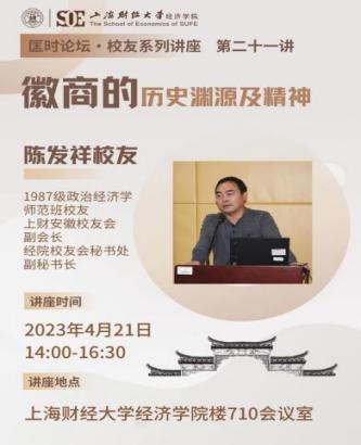 4月21日下午,经济学院校友系列讲座第二十一讲“徽商的历史渊源及精神”在上海财经大学经济学院楼710会议室举行,本次活动特邀安徽省新时代文明实践中心研究员、学院1987级政治经济学校友陈发祥研究员返校为同学们带来了一场生动的徽商的历史与文化的“思想盛宴”。学院经济史学系系主任、1998届校友程霖教授和本硕博师生等参会聆听。学院校友会负责人黄振兴常任教授主持会议。