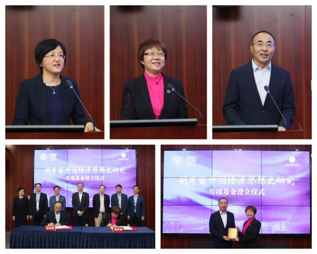 “胡寄窗中国经济思想史研究专项基金”设立仪式由上海财经大学中国经济思想发展研究院副院长、中国经济思想史学会副会长王昉教授主持,她阐述了胡寄窗先生对经济思想史学科发展的重要贡献,介绍了专项基金设立的背景。上海财经大学合作发展处处长陈红梅代表校方致辞,她表示,专项基金的设立是以大师之名扬大师之志,是铭记恩师、情系母校之举,是构筑学科体系、坚定学术自信之愿。上海财经大学校董、江苏和泰投资有限公司董事长吴亚东代表捐赠方致辞,他从与胡老的日常交往,与经济学院的渊源,以及对历史的兴趣三个方面介绍了基金设立的初衷。双方在各位领导及代表的见证下进行了捐赠签约并颁发了捐赠证书。