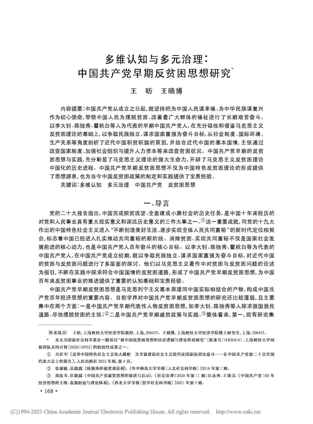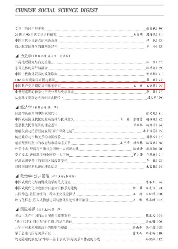 上海财经大学中国经济思想发展研究院副院长、经济学院教授王昉,与经济学院博士生王晓博(现为中国人民解放军国防大学政治学院讲师)发表在《中国经济史研究》2023年第3期的《多维认知与多元治理:中国共产党早期反贫困思想研究》,被《中国社会科学文摘》2023年第11期、人大复印报刊资料《经济史》第5期双转载。