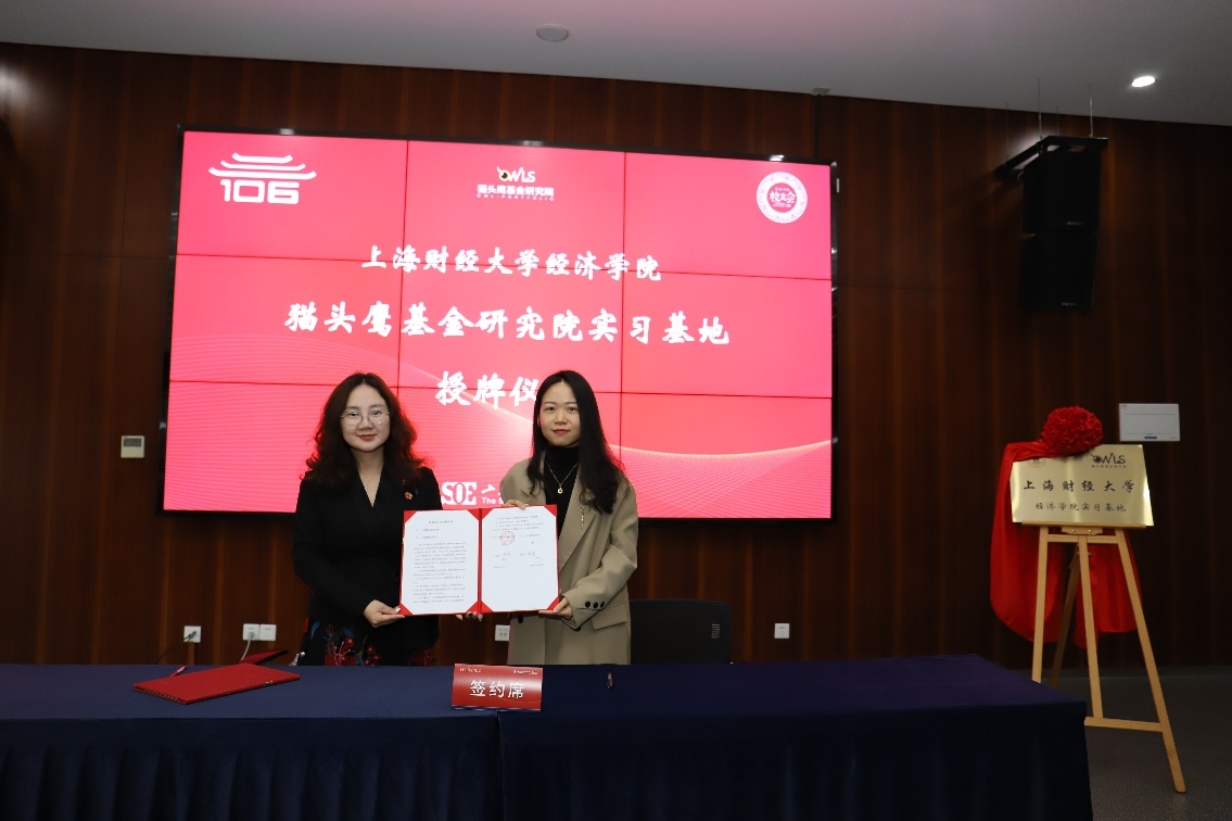揭牌签约环节,猫头鹰基金研究院向经济学院开放实习基地,彭莉董事长分别与经济学院副院长冒佩华、办公室主任张迪揭牌、签约。彭莉董事长向学院表达感谢,感谢学院为猫头鹰基金研究院积极培养买方投顾后备人才,今后公司也将积极开设买方投顾相关实习和实践活动。
