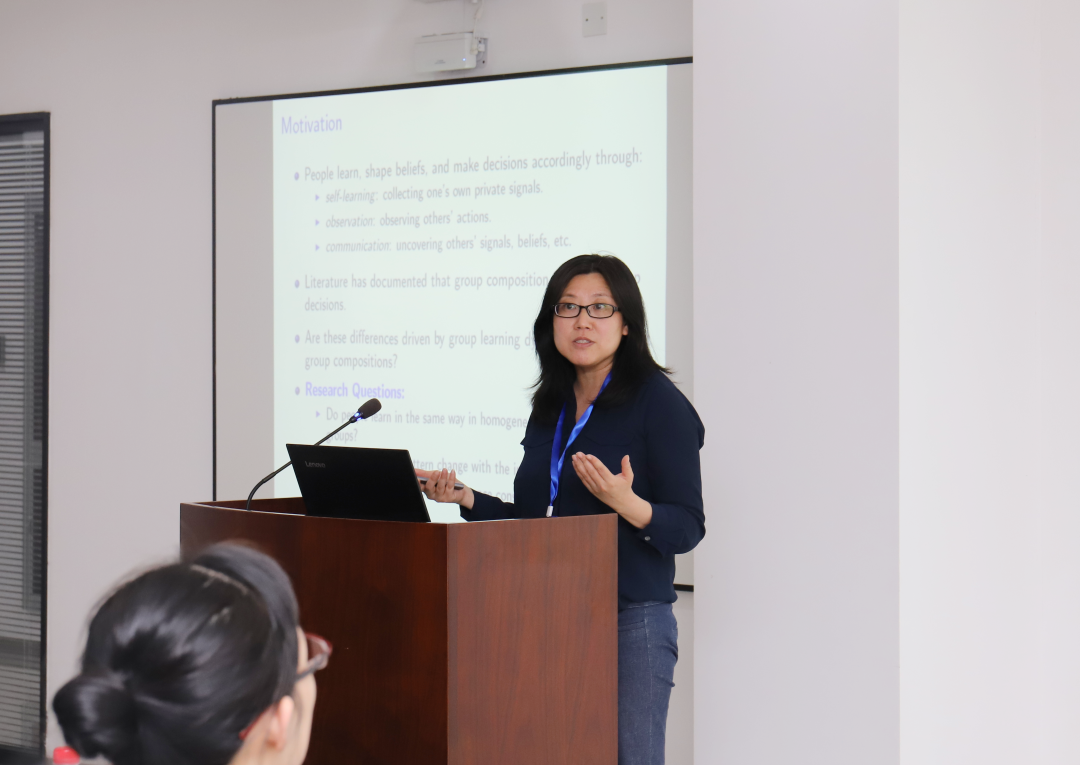 27日下午的会场由杜宁华常任教授主持。阿肯色大学Sherry Li教授作题为“Risk Preference, Investment Decision, and Household Welfare: Evidence from a Microcredit Experiment in Bangladesh”的主旨报告。厦门大学耿森副教授、山东大学姜树广教授、詹姆斯麦迪逊大学丁婷婷助理教授分别就“The Errors behind Being Persuaded”“Financial Pressure and Economic Decision-Making: Evidence from Three Indenpendent Experiements”“Should Birds of a Feather Learn Together? An Experimental Study on How Group Composition Affects Social Learning”主题展开专题报告。
