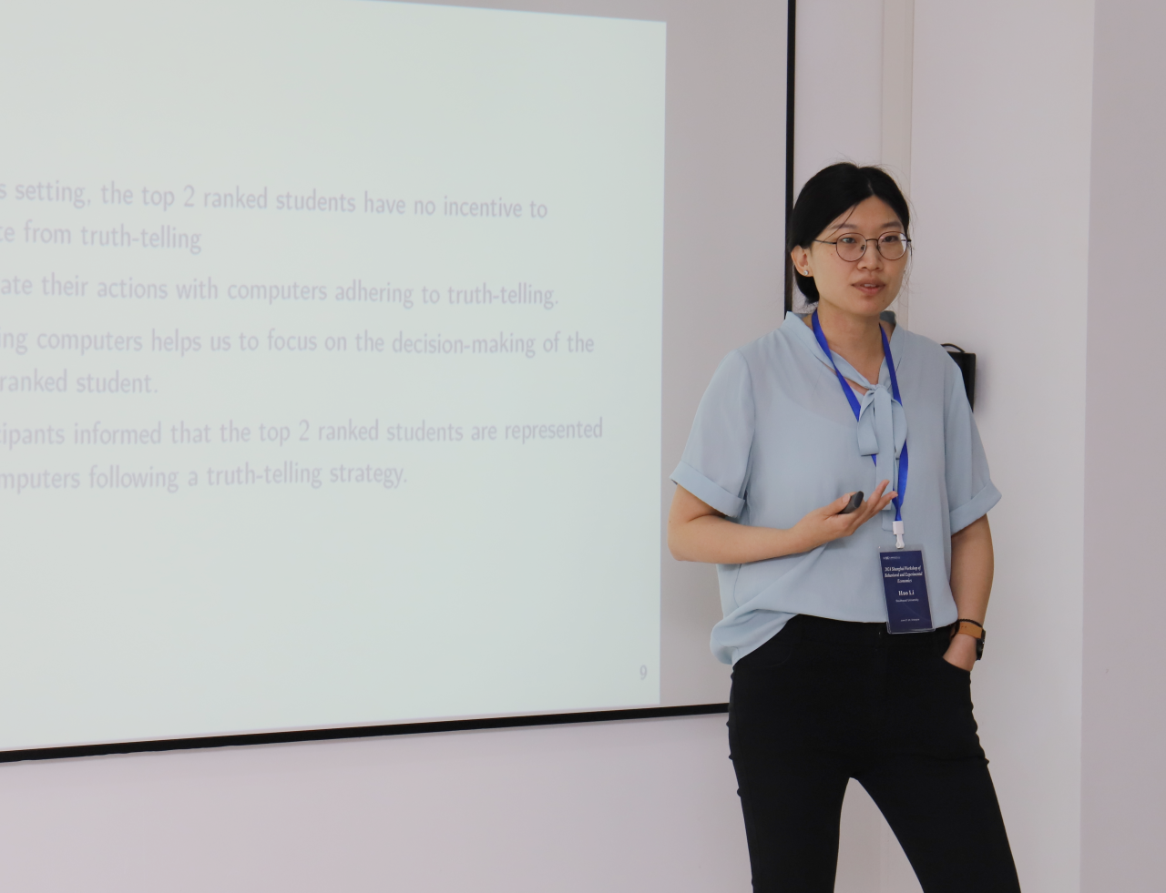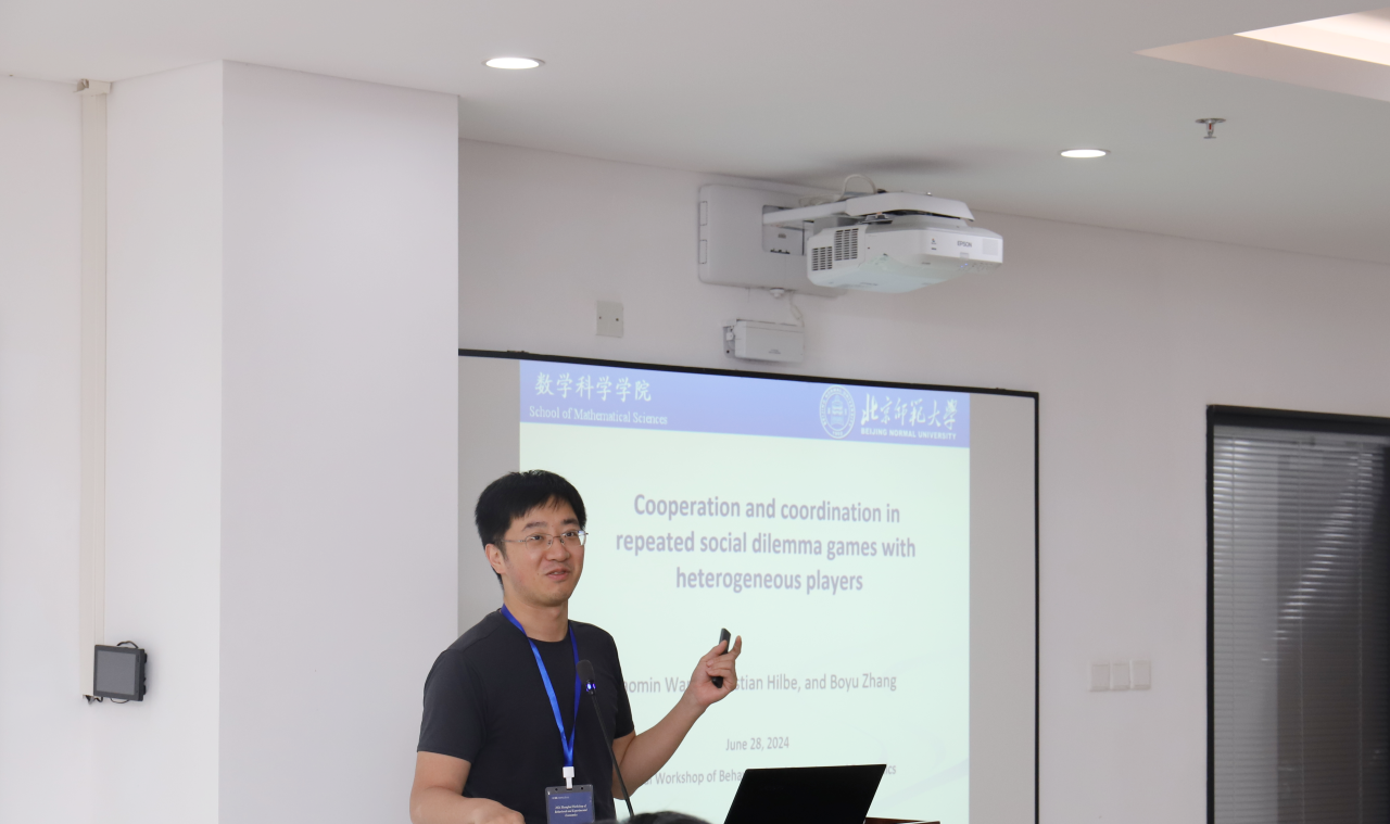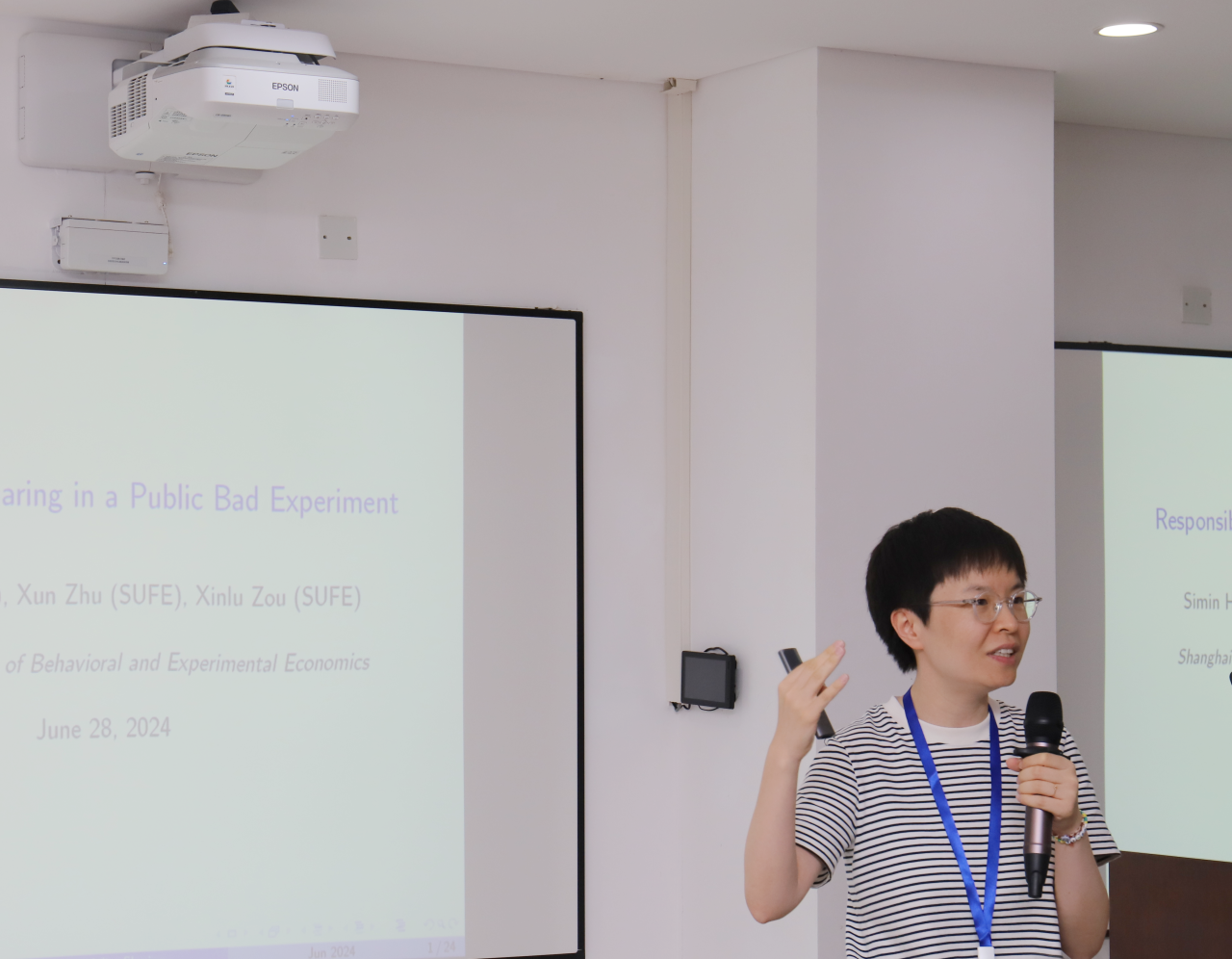 28日下午,姚澜常任教授主持会议。北京师范大学张博宇教授、多伦多都会大学宋菲教授、上海财经大学贺思民常任副教授、上海财经大学姚澜常任教授分别就“Cooperation and Coordination in Repeated Social Dilemma Games with Heterogeneous Players”“Conditional Cooperation in Solving Collection Action Problems: An Experimental Investigation”“Responsibility Sharing in a Public Bad Experiment”“Collective Punishment with Moral Dilemma”主题展开报告。