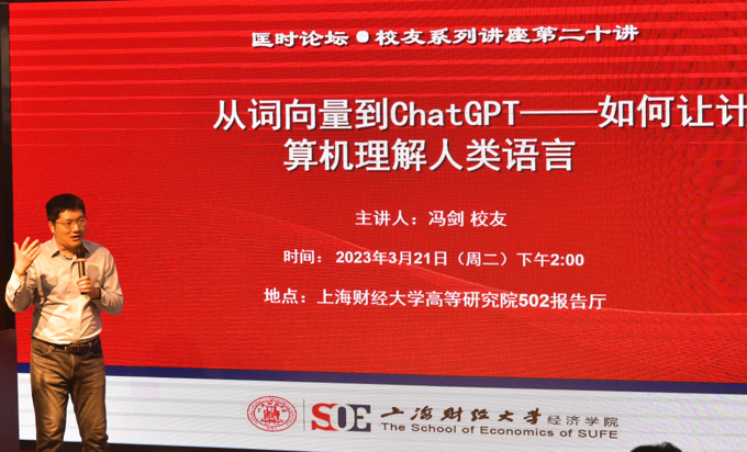 【合作发展】匡时论坛 | 冯剑校友做客上财经院校友系列讲座第二十讲 2023-03-30 3月21日星期二下午,经济学院校友系列讲座第二十讲“从词向量到ChatGPT——如何让计算机理解人类语言”在上海财经大学武川路校区高等研究院502报告厅举行,本次活动特邀复旦大学博士、KPMG金融科技专家库成员-冯剑校友来校与同学们进行了面对面的交流,讲座现场,同学们通...