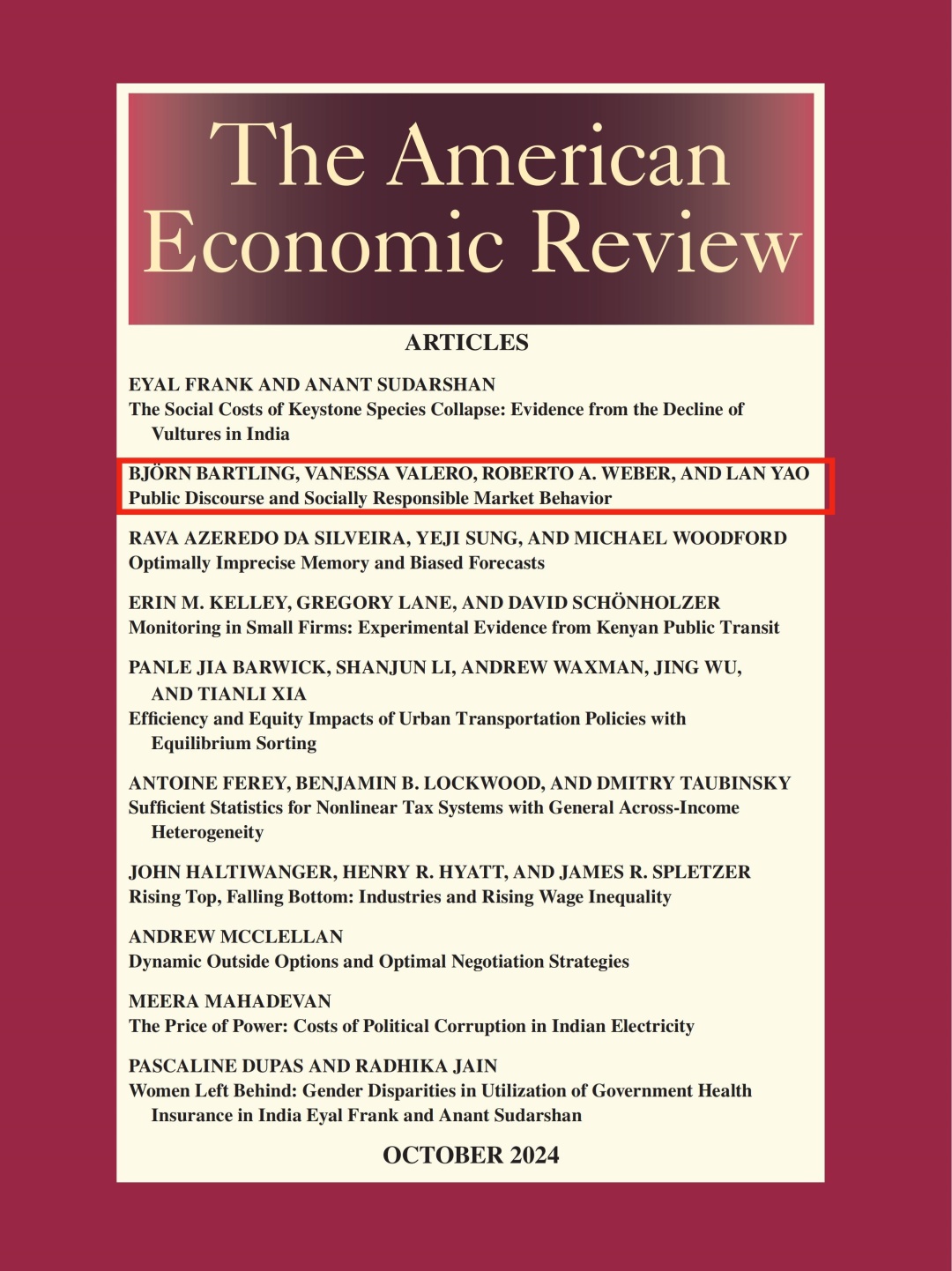 近期,上海财经大学经济学院微观经济学系姚澜常任教授合作论文Public Discourse and Socially Responsible Market Behavior在经济学国际顶尖期刊American Economic Review正式发表。