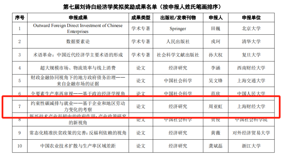 近日,刘诗白经济学奖评奖委员会办公室公示了第七届刘诗白经济学奖评选结果,公示期为2024年10月28日至11月3日(共7天)。经资格审核、专家通讯评审和会议评审以及评奖委员会审定,第七届刘诗白经济学奖共评选产生拟奖励成果10项。上海财经大学经济学院周亚虹教授论文《约束性碳减排与就业——基于企业和地区劳动力变化的考察》入选。