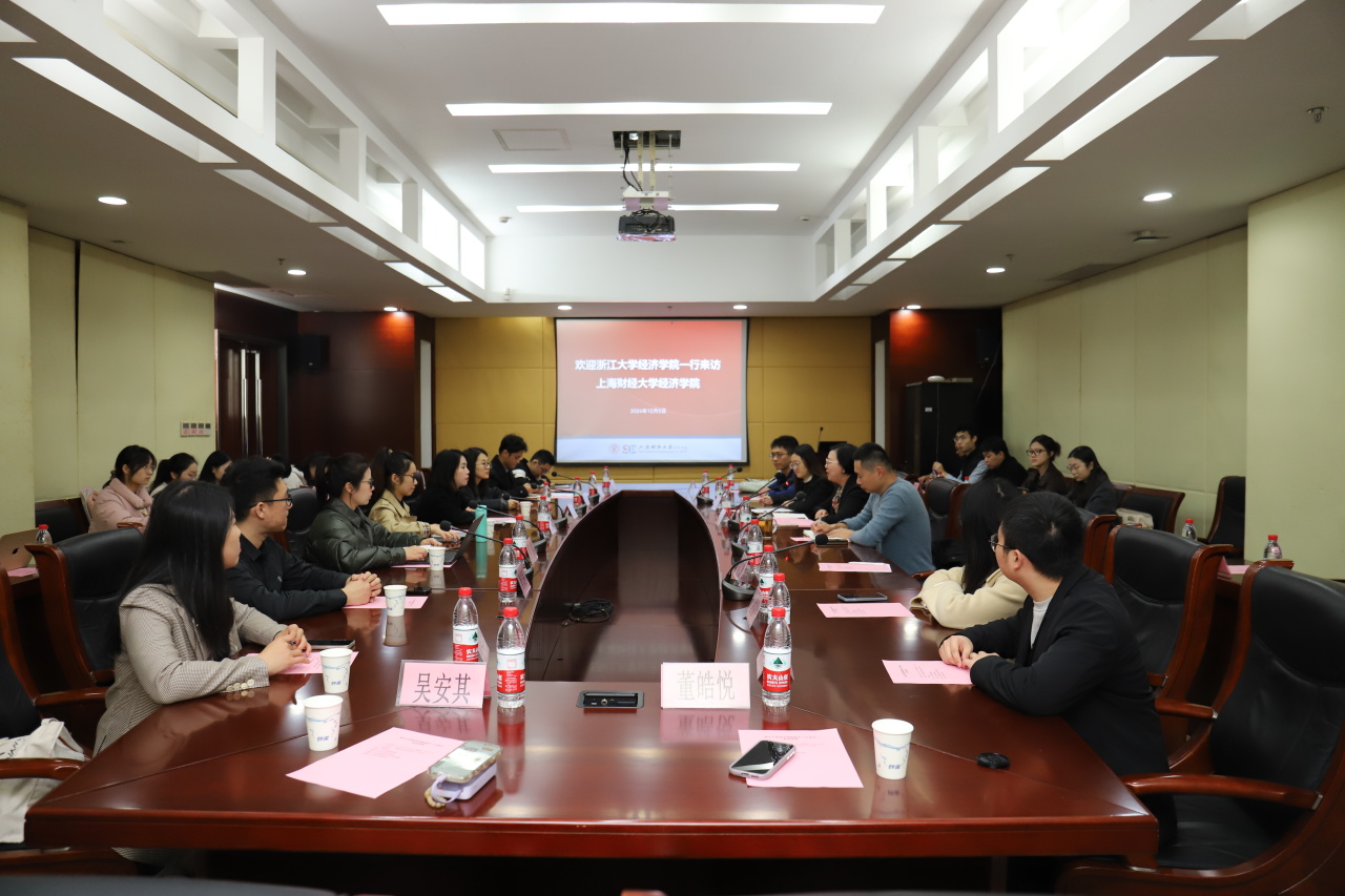2024年12月5日下午,浙江大学经济学院党委副书记、纪委书记梁艳,职业生涯与发展中心主任胡想相,团委副书记沈艳以及研博会主要学生干部代表一行来我院交流调研。双方在经济学院710会议室举行座谈会,就学生思政工作、学生就业工作以及特色品牌建设经验等主题进行深入交流探讨。上海财经大学经济学院党委副书记、纪委书记金晓茜接待来访并交流,学生办公室主任崔士超、研究生辅导员王佳瑞、研究生会主要学生干部代表参加座谈会。