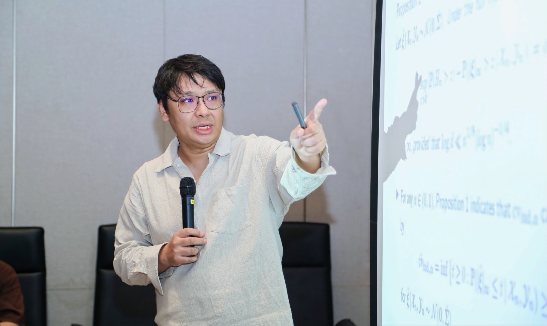 西南财经大学统计交叉创新研究院执行院长常晋源教授作题为“Testing Independence and Conditional Independence in High Dimensions via Coordinatewise Gaussianization”的报告。他介绍了如何在高维的情况下利用高斯变换来检验独立性和条件独立性的新方法,并对其方法的应用面进行了深入展开,为计量经济学的假设检验提供了新渠道。