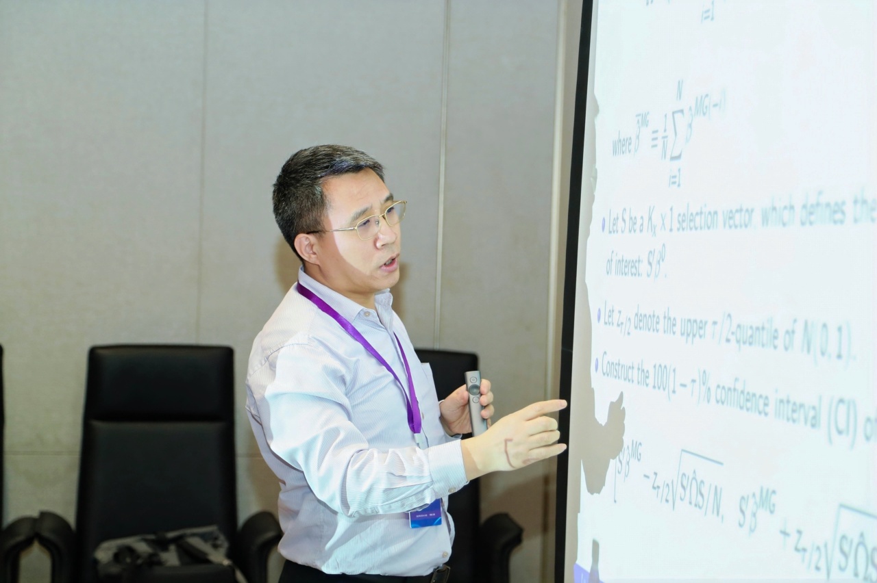 清华大学经济管理学院的苏良军教授作题为“On Generalized CCE Estimation”的报告。他介绍了一种处理面板数据中由于横截面依赖问题的新方法,可以解决回归中由于不同个体误差项之间可能存在相关性,进而导致的估计偏误的问题。他的发现为解决传统回归分析中存在的内生性提供了新的视角与解释。