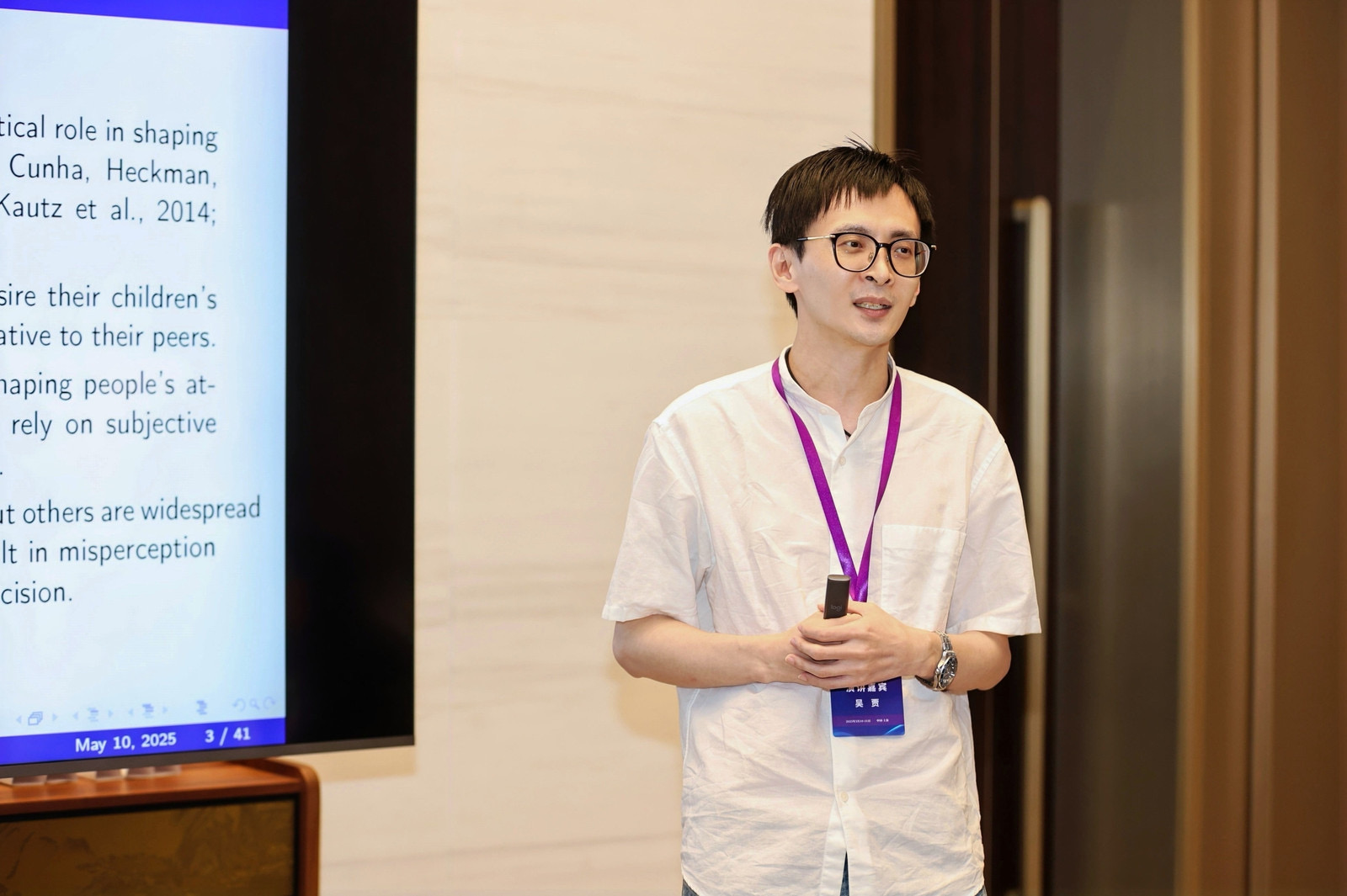 中山大学岭南学院吴贾教授作题为“Parents’ Misperceptions, Educational Investment, and Children’s Skill Formation: Evidence from a Field Experiment in Rural China”的报告,探讨了在教育竞争激烈的背景下,父母对周围其他人的错误感知如何影响他们对子女的教育投入。该研究基于多轮田野调查和干预实验,发现父母普遍低估了周围其他家庭父母对子女的教育投入,这种低估尤其表现在对子女的时间陪伴方面。通过信息干预,研究者向父母提供了同校同年级其他家庭的真实教育投入,结果发现其显著纠正了父母原有的感知偏差,进而促使对子女教育投入和陪伴时间的增加,并提升了子女的认知和非认知能力。最后,作者讨论了未来将在教育经济学和行为经济学交叉领域继续推进的可能研究方向。