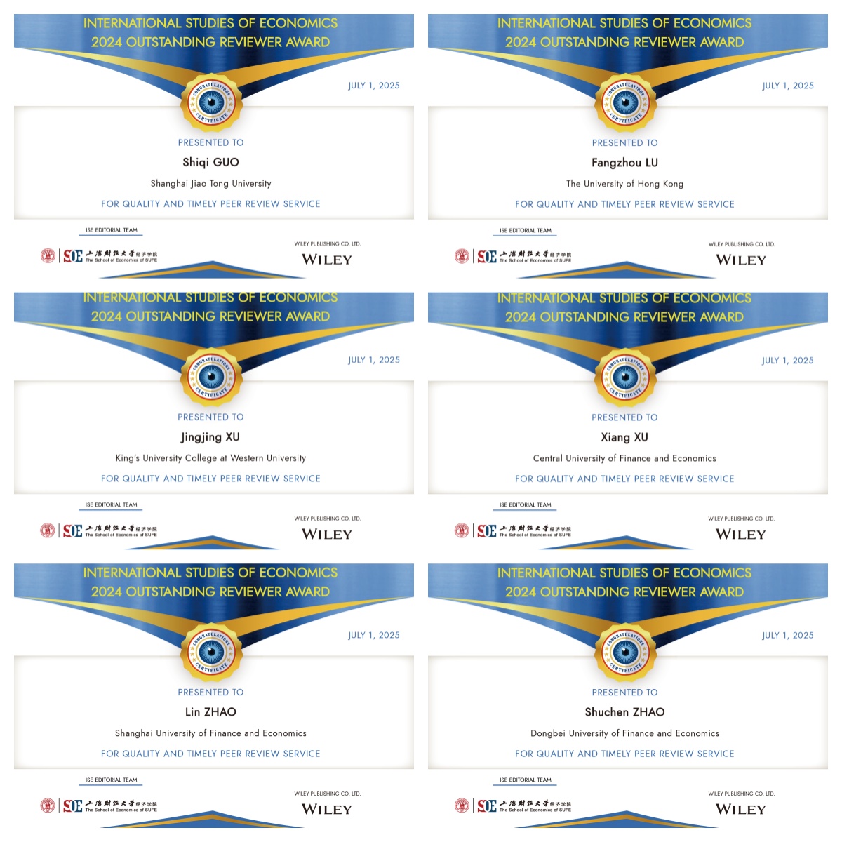 International Studies of Economics第一届(2024年度)卓越审稿人奖评选工作已于近日完成。主编团队(含专辑特邀编辑)从2024年百余名参评者中综合考量审稿报告质量、审稿时效性及审稿工作量等核心指标,最终遴选出6位杰出审稿人(按姓氏拼音排序):