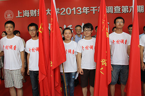 2013年7月10日,上海财经大学千村调查第六期出征仪式于学生中心大厅举行,校党委副书记刘永章、校长助理蒋传海、相关职能部门负责人及第六期专家组成员出席了千村调查出征仪式,各学院(系、所)学生工作书记和学生代表共计100余人参加了出征仪式。