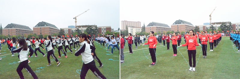 花样跳绳团体操比赛和展示 开幕式后迎来花样跳绳团体操比赛,同学们蓬勃的朝气与饱满的精神为本届运动会正式拉开序幕。经院师生为了此次花样跳绳团体操展示,多次集中训练,仔细研究每一个动作细节,努力做到整齐划一。 9时30分起,学生各类田径项目和教职工趣味运动项目分别展开。不同于往日严肃规整的运动会形式,教职工趣味运动包括陆地“风火轮”、指压板跳绳、快乐铅笔等极具趣味性的运动项目,操场上充满欢声笑语。在陆地“风火轮”比赛中,经院队员群策群力、以坚持不懈的精神完成比赛;在指压板跳绳比赛中,15名队员团结一心、凭借顽强的毅力赢得阵阵好评;在快乐铅笔比赛中,2组队员配合默契、精准潇洒地在纸上书写了“SUFE”。我院参赛教师代表纷纷表示,通过运动会能极大地增进同事之间的交流,也让身心得到放松。