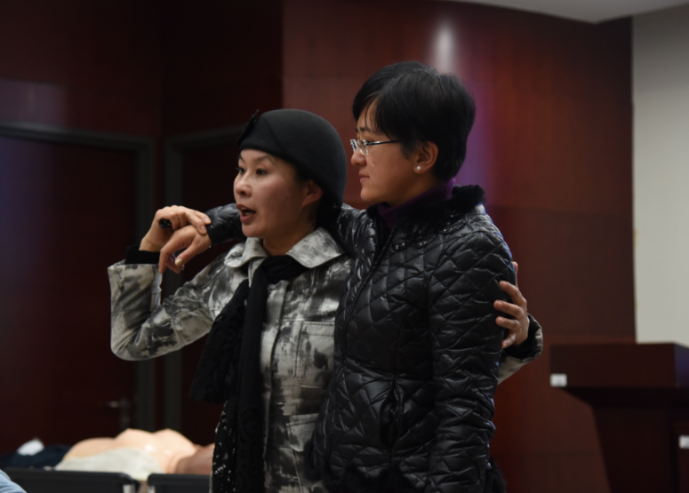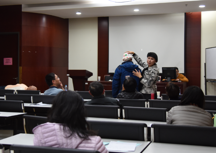 上海市红十字培训交流中心姚月琴主任 此次活动邀请到了上海市红十字培训交流中心姚月琴主任进行现场培训。姚主任分心肺复苏、气道梗塞、创伤救护、突发事件意外伤害等四大部分内容向大家作了怎样进行初级急救的详细讲解。在讲解中,姚月琴主任还穿插进行模拟示范、互动演练等,进一步加深了老师们的印象。比如,她利用人体道具模型示范了如何实施心肺复苏;与学院老师互动演示了如何进行海姆立克急救;模拟演示了骨折、出血的紧急处理方式,指导参训人员使用纱布、三角巾为他人包扎,演示骨折定位等急救技能。姚主任介绍的内容既精彩又实用,老师们的参与热情非常高,边听边模拟。